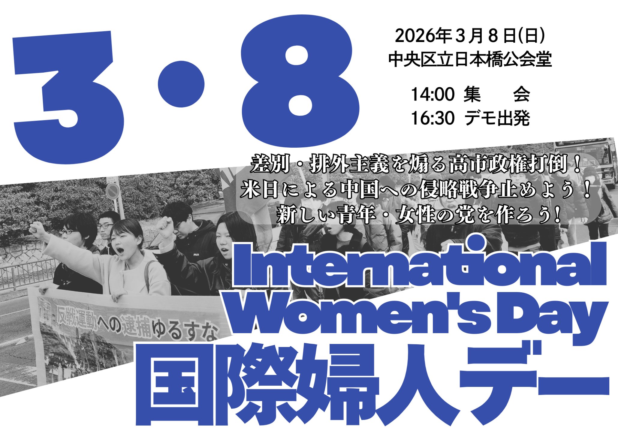 私たち全学連に結集する学生と、それを支持する青年・女性・労働者たちは、この腐敗しきった状況を徹底的に批判し主体的に乗り越えるべく、青年・女性・労働者を中軸とした新たな政党を創成しようとしています。戦前来、日本の社会運動の致命的弱点としてあった左派の差別・排外主義への屈服、とりわけ女性差別への屈服という課題をえぐり出し、三度目の世界戦争を絶対に阻止しなければなりません。日本革命-世界革命をなんとしてでも手繰り寄せる新たな革命党を共に建設しましょう!その闘いの出発点として、本年の歴史的な3・8国際婦人デー行動に結集し、反戦・反差別の行動に立ち上がりましょう!