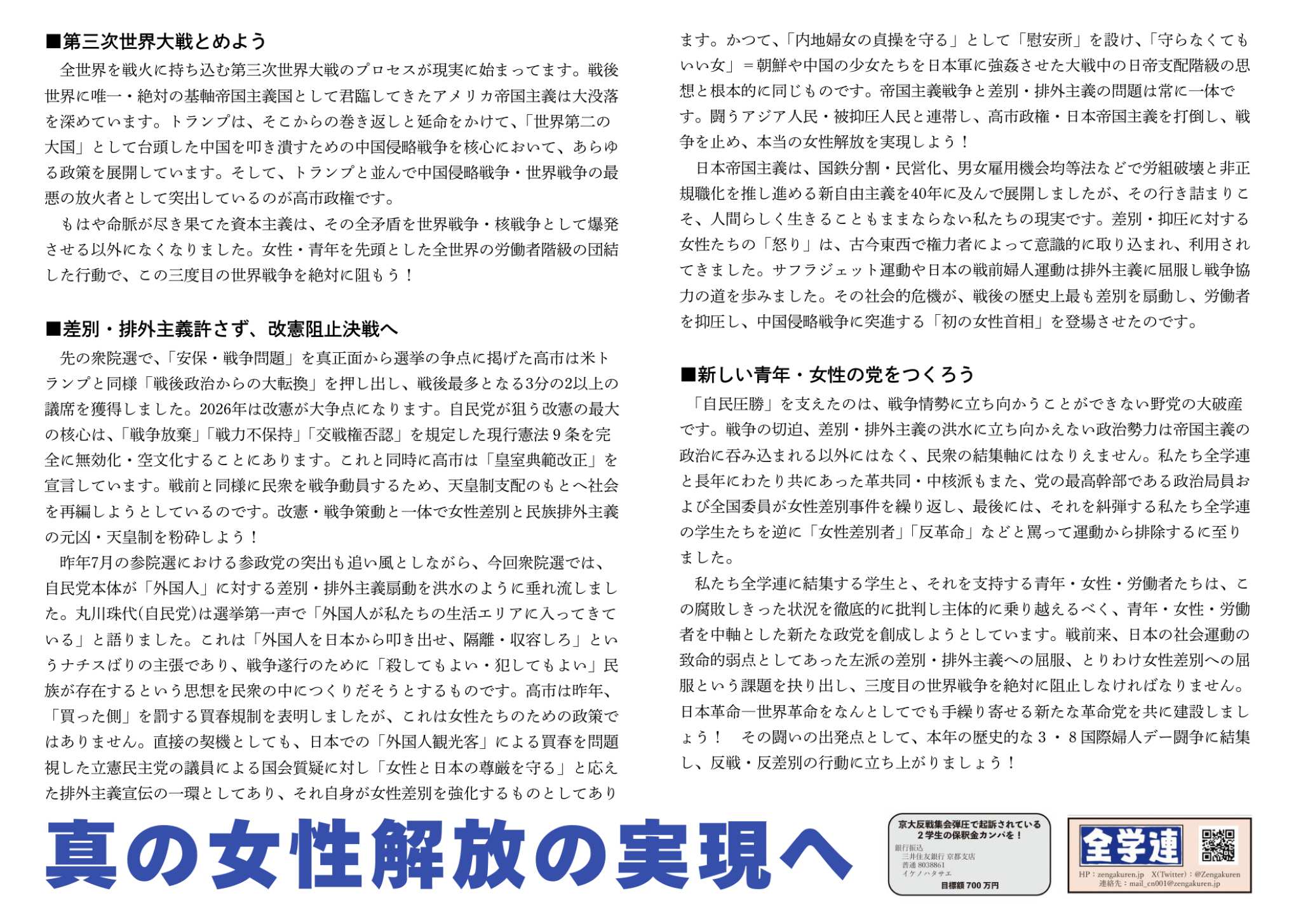 先の衆院選で、「安保・戦争問題」を真正面から選挙の争点に掲げた高市は米トランプと同様「戦後政治からの大転換」を押し出し、戦後最多となる3分の2以上の議席を獲得しました。2026年は改憲が大争点になります。自民党が狙う改憲の最大の核心は、「戦争放棄」「戦力不保持」「交戦権否認」を規定した現行憲法9条を完全に無効化・空文化することにあります。これと同時に高市は「皇室典範改正」を宣言しています。戦前と同様に民衆を戦争動員するため、天皇制支配のもとへ社会を再編しようとしているのです。改憲・戦争策動と一体で女性差別と民族排外主義の元凶・天皇制を粉砕しよう!