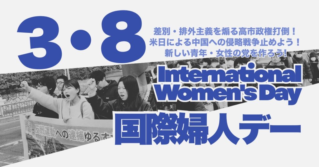 私たち全学連に結集する学生と、それを支持する青年・女性・労働者たちは、この腐敗しきった状況を徹底的に批判し主体的に乗り越えるべく、青年・女性・労働者を中軸とした新たな政党を創成しようとしています。戦前来、日本の社会運動の致命的弱点としてあった左派の差別・排外主義への屈服、とりわけ女性差別への屈服という課題をえぐり出し、三度目の世界戦争を絶対に阻止しなければなりません。日本革命-世界革命をなんとしてでも手繰り寄せる新たな革命党を共に建設しましょう!その闘いの出発点として、本年の歴史的な3・8国際婦人デー行動に結集し、反戦・反差別の行動に立ち上がりましょう!