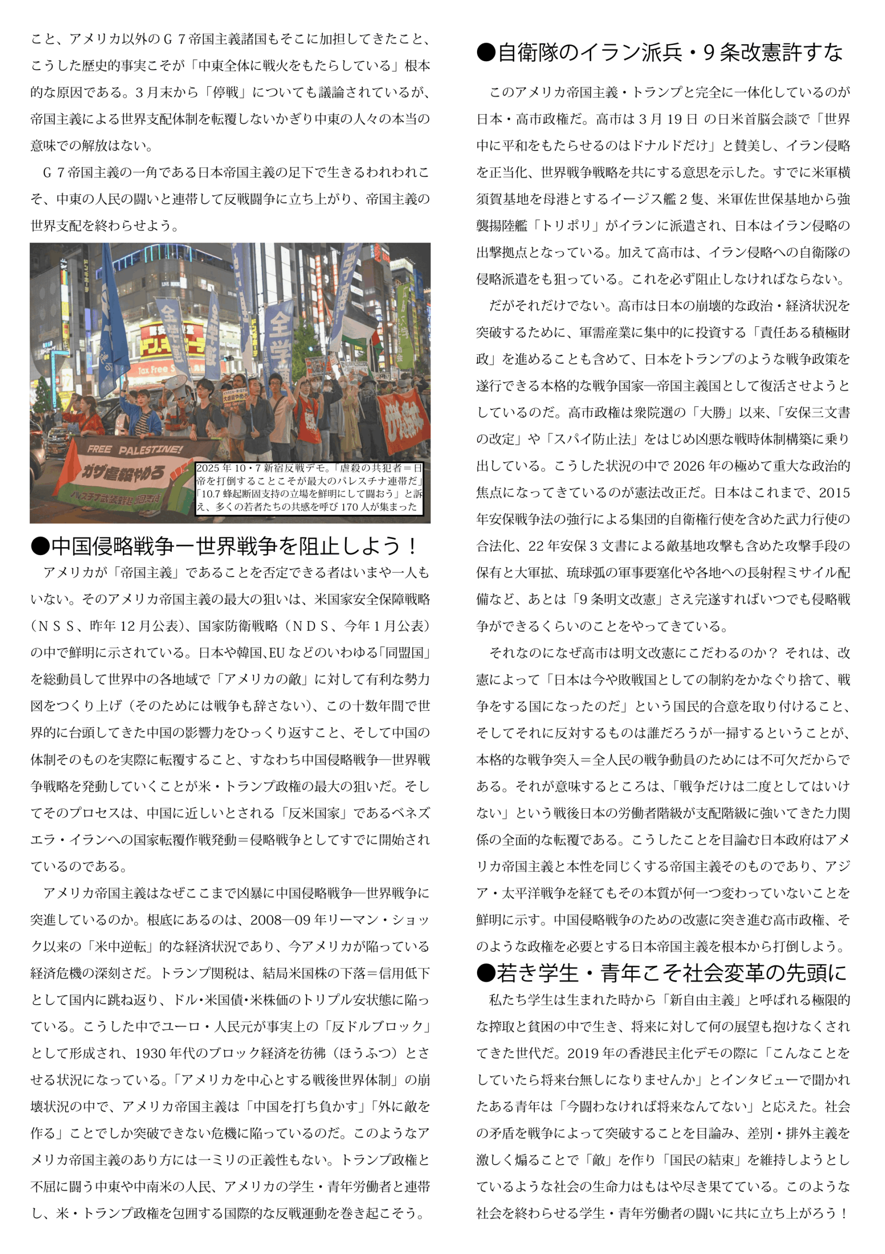 日本の高市政権は、米・トランプ政権が侵略戦争によってつくり出そうとしているアメリカ中心の「秩序」を賛美している。3月19日 の日米首脳会談で高市は「世界中に平和をもたらせるのはドナルドだけ」と発言した。これこそ日本・高市政権の本性だ。戦火を拡大させ続ける日米両政府を倒す反戦闘争に共に立ち上がろう!