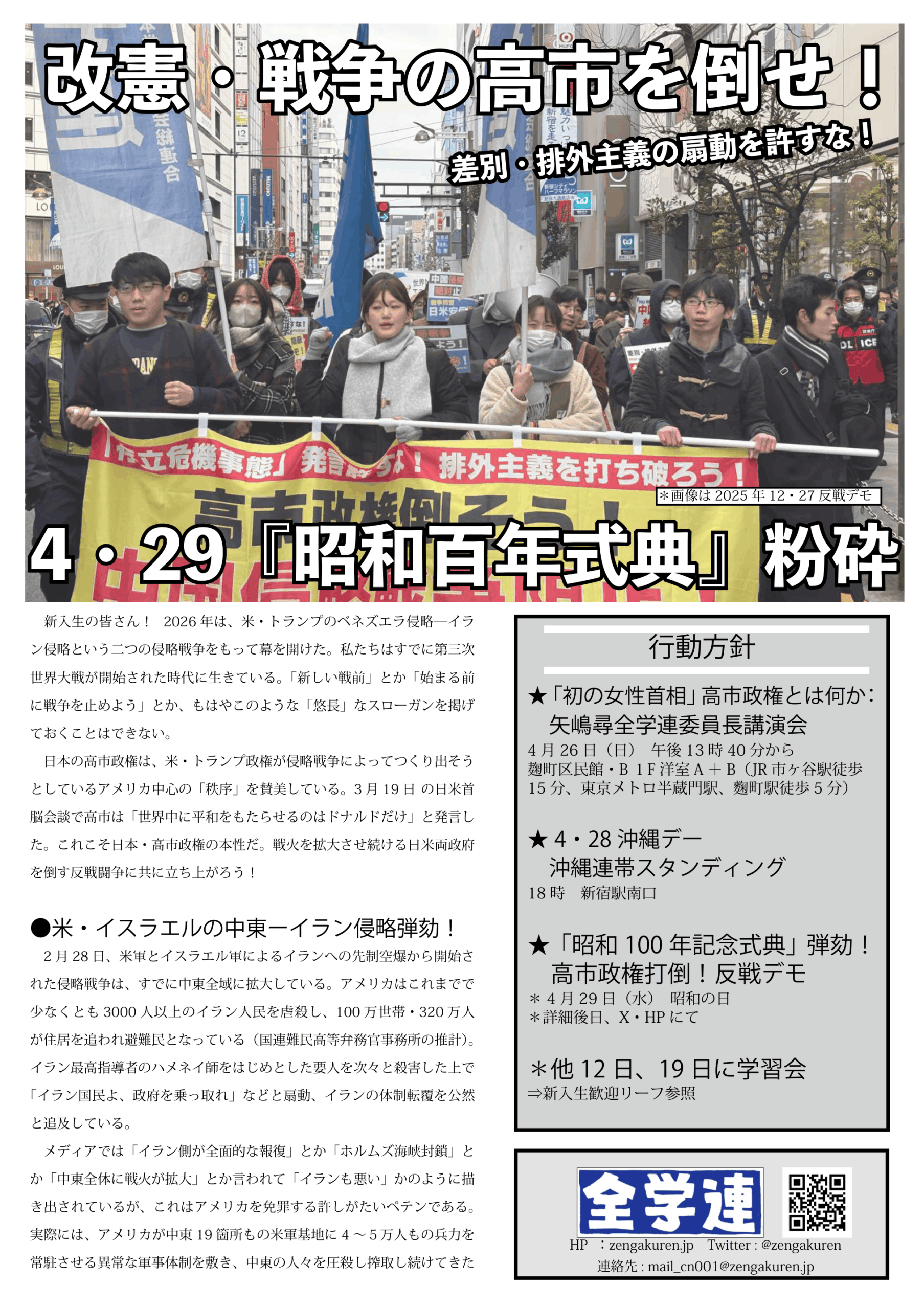 新入生の皆さん! 2026年は、米・トランプのベネズエラ侵略―イラン侵略という二つの侵略戦争をもって幕を開けた。私たちはすでに第三次世界大戦が開始された時代に生きている。「新しい戦前」とか「始まる前に戦争を止めよう」とか、もはやこのような「悠長」なスローガンを掲げておくことはできない。